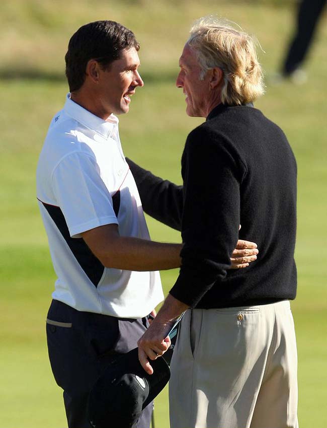 Padraig Harrington being congratulated by Greg Norman following the Irishman’s remarkable 2008 Open Championship victory.