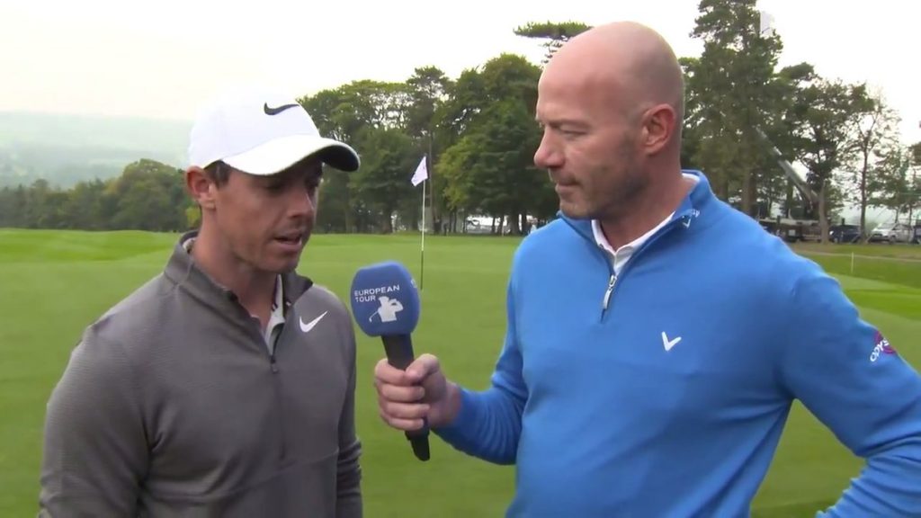 Newcastle footballing legend Alan Shearer interviews Rory McIlroy ahead of 2017 British Masters. (Photo – European Tour/Getty)