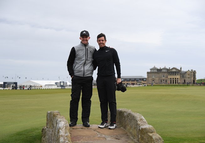 Connor Syme and Rory McIlroy on the famed Swilcan Bridge at St. Andrews (Photo – European Tour/Gettys)