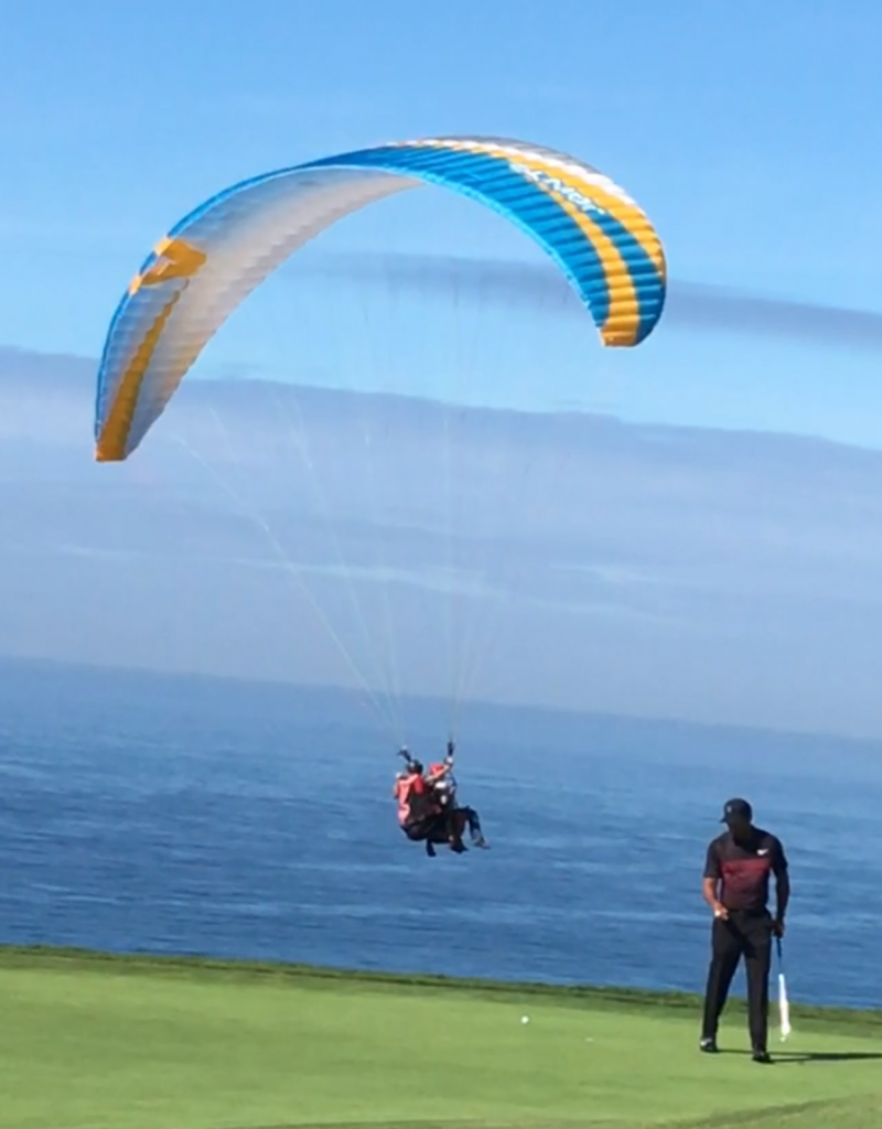 A hang-glider buzzes Tiger Woods on the 4th green during the opening day of the Farmers Insurance Open. (Photo – www.golfbytourmiss.com)