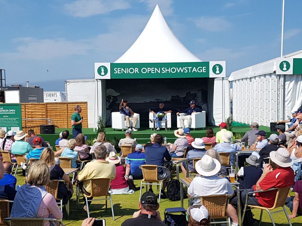 Paul McGinley joins USA Ryder Cup captains Tom Lehman and Tom Watson on stage after their first round of the 2018 Senior Open at St. Andrews
