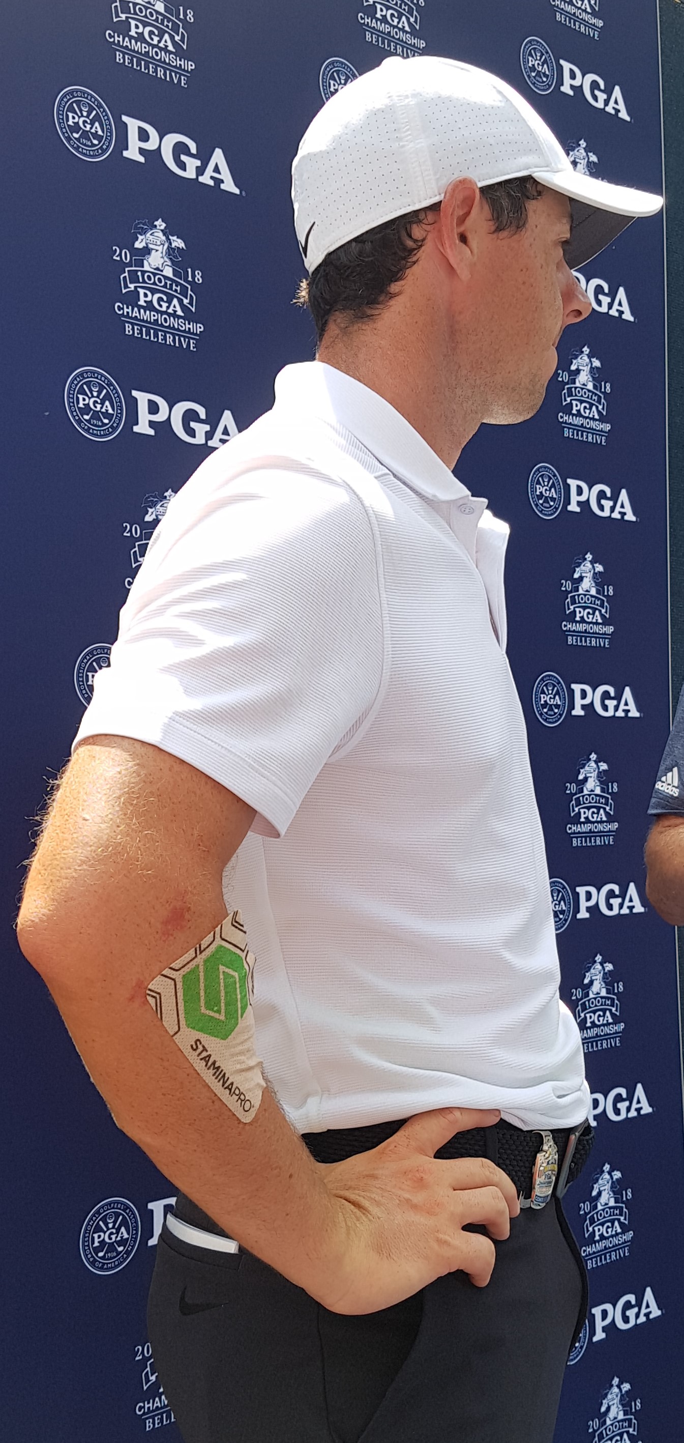 Rory McIlroy sporting anti-inflamatory take on his right forearm (PHoto @tourmiss)