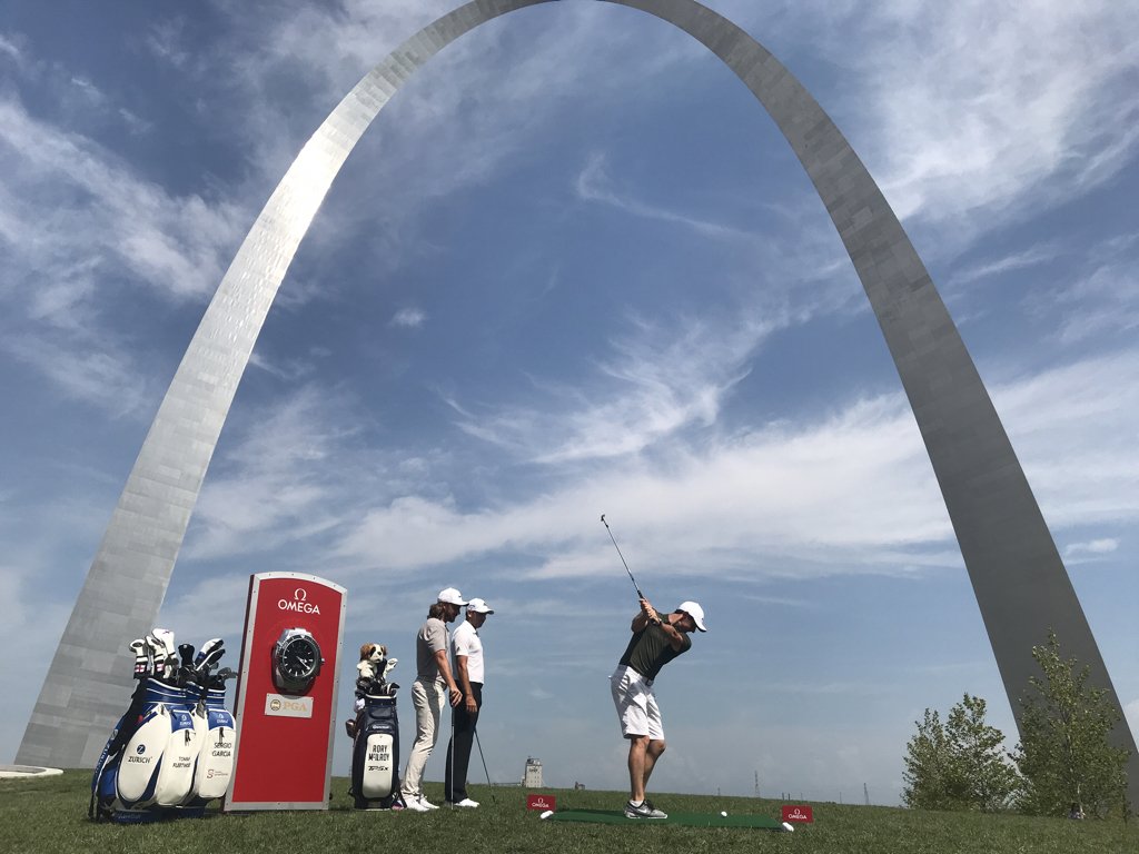 Rory McIlroy joins Sergio Garcia and Tommy Fleetwood hitting balls Monday after the famed ‘Gateway to the West’ arch in St. Louis