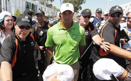 He was ringed by four local Paramus Police officers on route to posting a level par 71 on the opening day of the Northern Trust and Woods first FedEx Cup Play-Off Series event in five years.