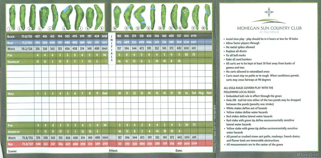 Mohegan Sun offers four different tees – Black measuring 6,790 yards; Blue at 6,471 yards; White measuing 6,111 and for the Ladies, the Red tees play to 5,742-yards.