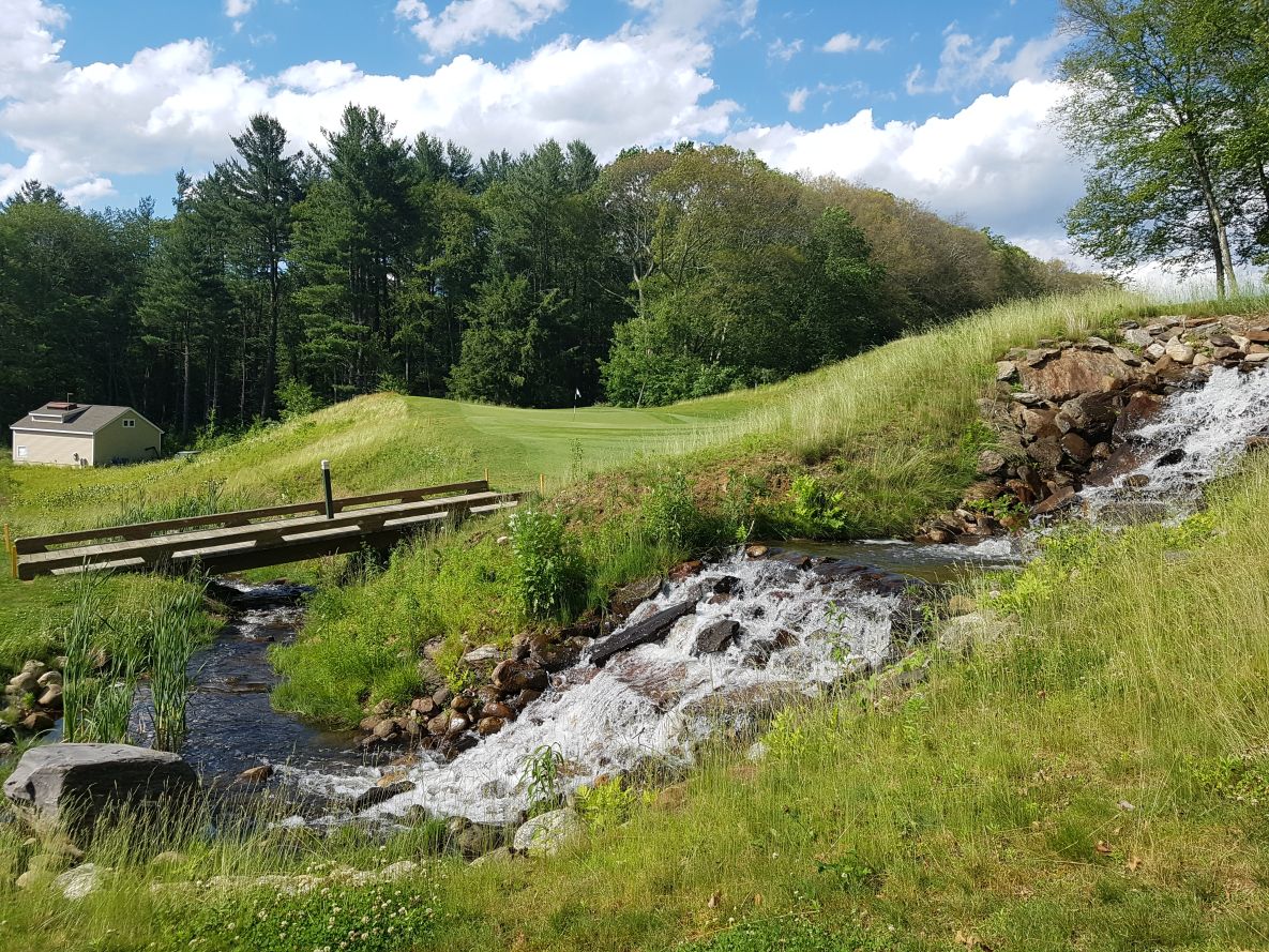 A waterfall feature short of the 6th green at Mohegan Sun, GC and with the green visible in the distance. (Photo – @tourmiss)