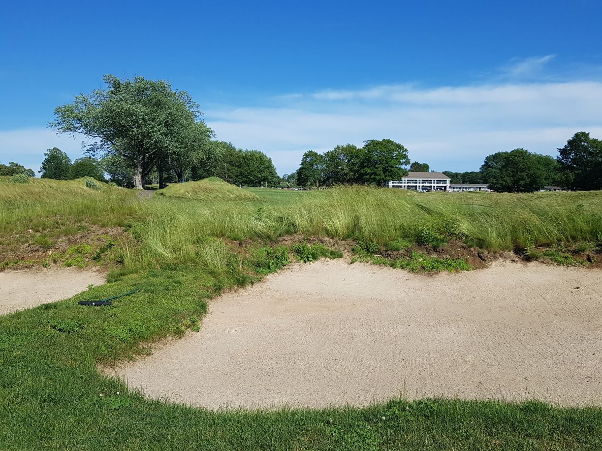 Bunkering on the dog-leg at the par-4 ninth hole and with the Mohegan Sun cluhouse also in the distance. (Photo – @tourmiss)