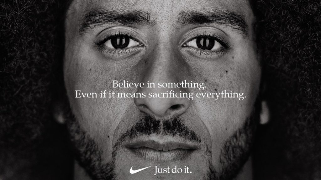 The new Nike ad campaign was released before the start of the new NFL season, features a close-up black-and-white shot of Kaerpernick, along with the words, “Believe in something, even if it means sacrificing everything.”