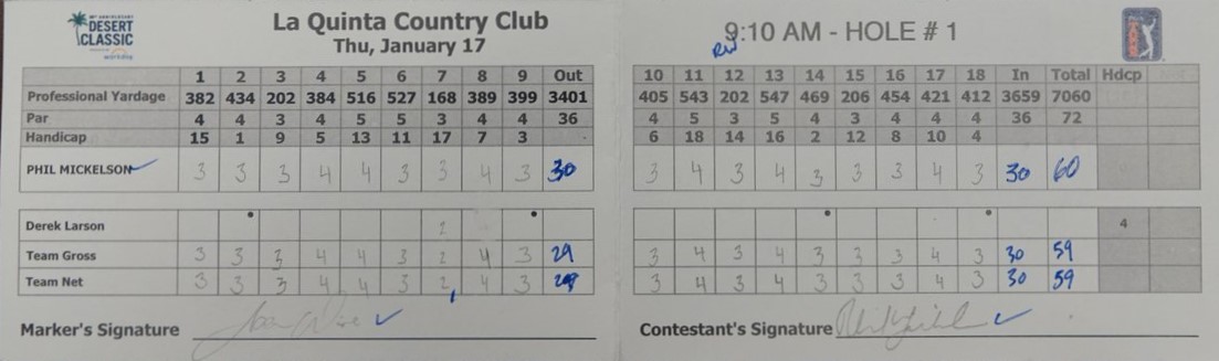 Mickelson’s 60 comes also on the 20th anniversary that David Duval posted a final round 59 to win the 1999 Bob Hope Chrysler Classic also at La Quinta.