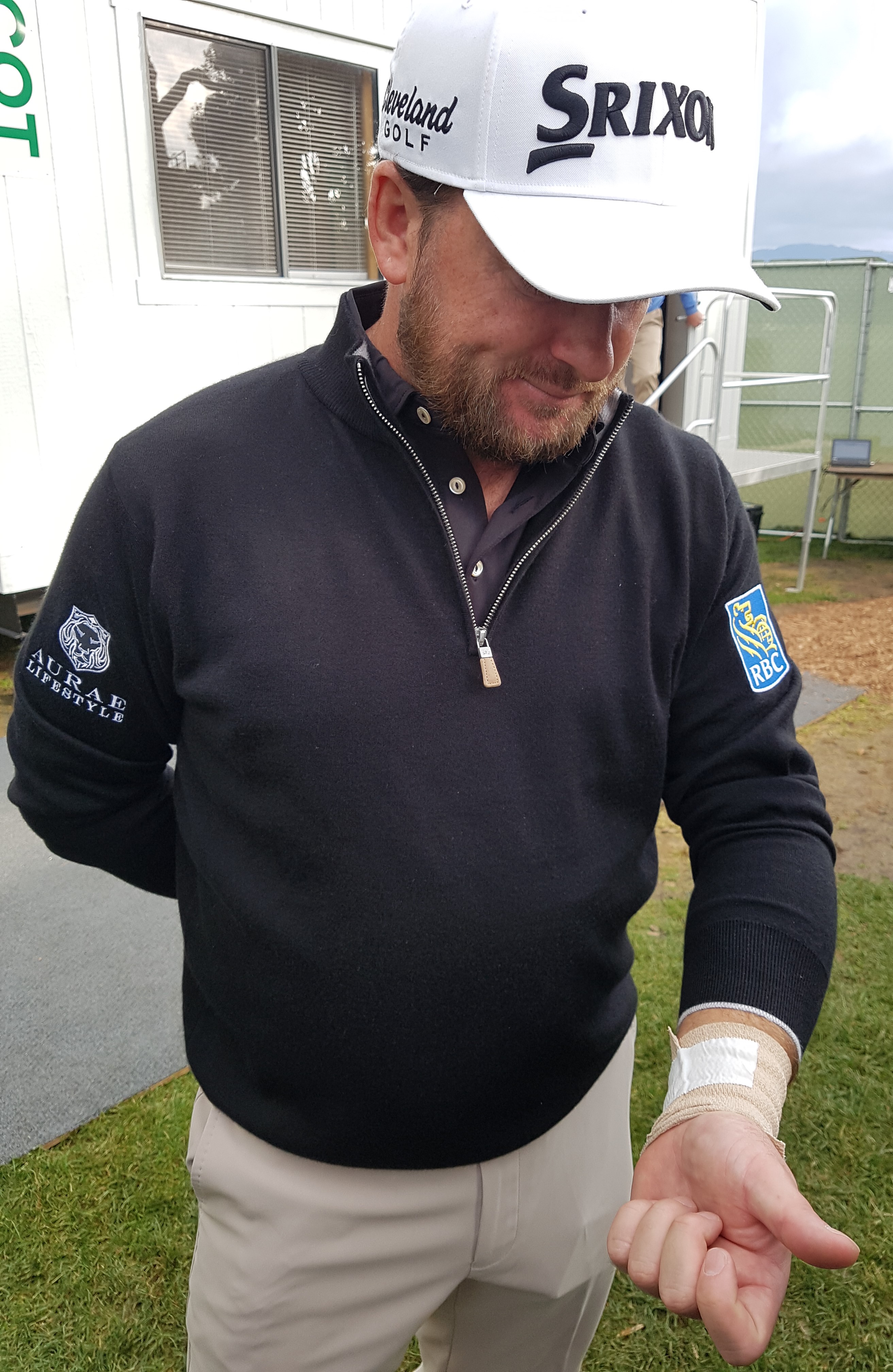 G Mac shows his left wrist strapped after posting a four-under par 68 on day one of the T & T Pebble Beach Pro-Am. (Exclusive photo – www.golfbytourmiss.com)