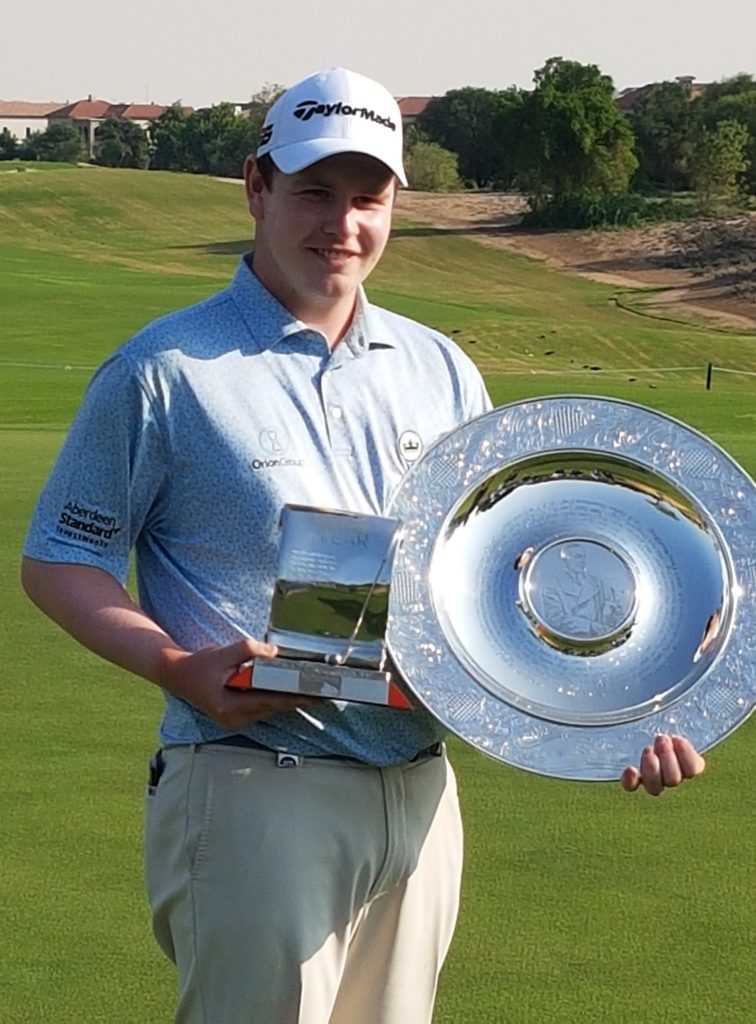 Scotland’s Robert MacIntyre holding in his left hand the leading ‘Graduate of the Year’ off the secondary Challenge Tour and in his left hand the ‘Rookie of the Year’ trophy. (Photo @tourmiss)