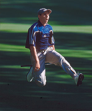 Late in the final round, García with his ball up against a tree trunk in the right rough on the 16th hole, and the green hidden from view, swung hard with his eyes shut and hit a low curving fade that ran up onto the green. As the shot travelled, he sprinted madly into the fairway and then scissor-kick jumped to see the result.