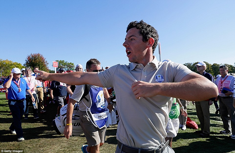 Rory McIlroy points to a fan who used a very expletive term as he walked off the eighth green at Hazeltine