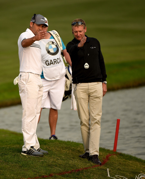 Tour referee, Mark LItton (right adjudicating on a rules matter with Sergio Garcia & now at the centre of handing Graeme McDowell a ‘yellow card’ bad time warning at the Saudi International