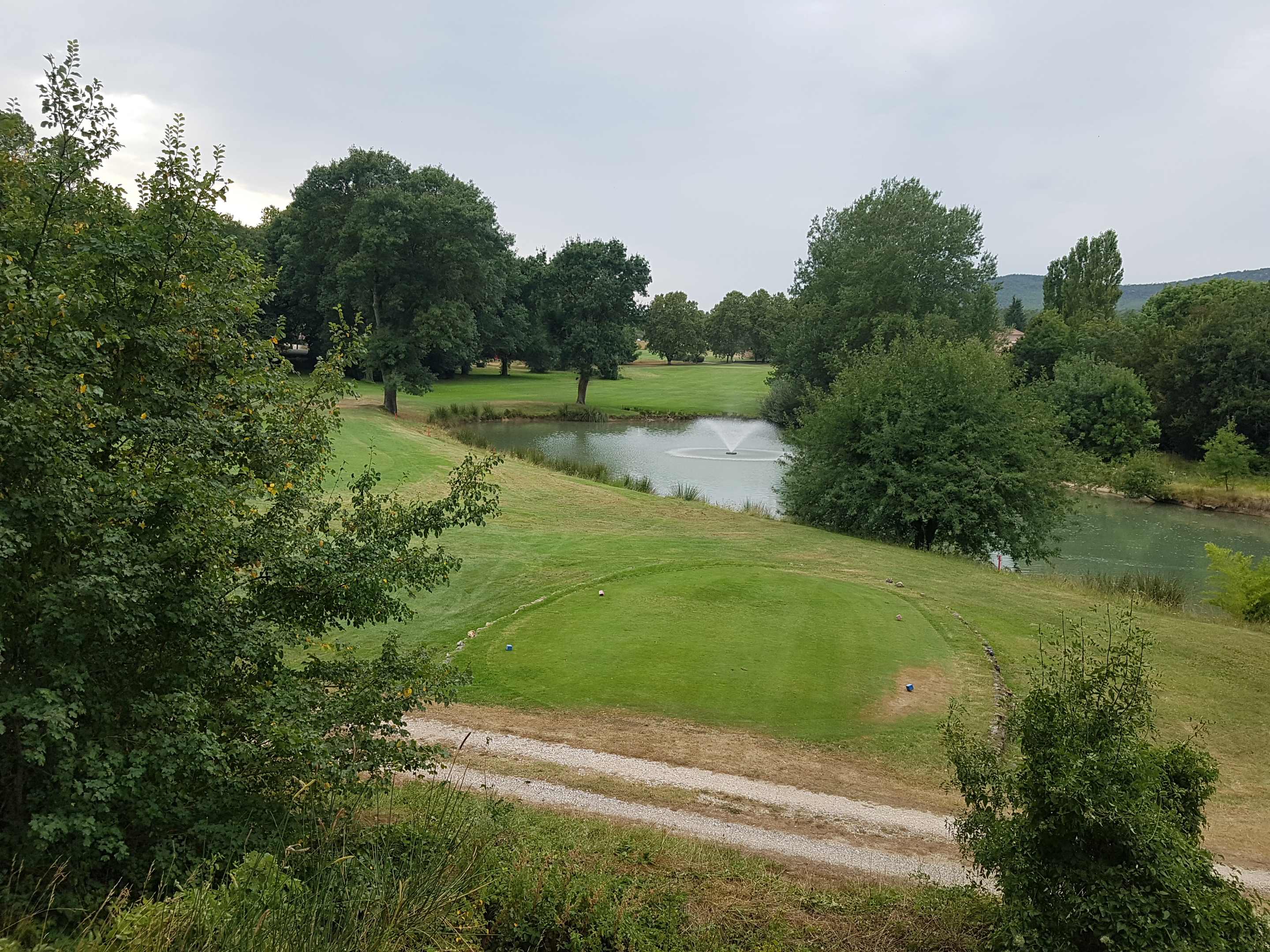 The view off Sainte Baume’s second tee – a tee shot needing to clear the water and the trees to find the fairway. Photo – www.golfbytourmiss.com