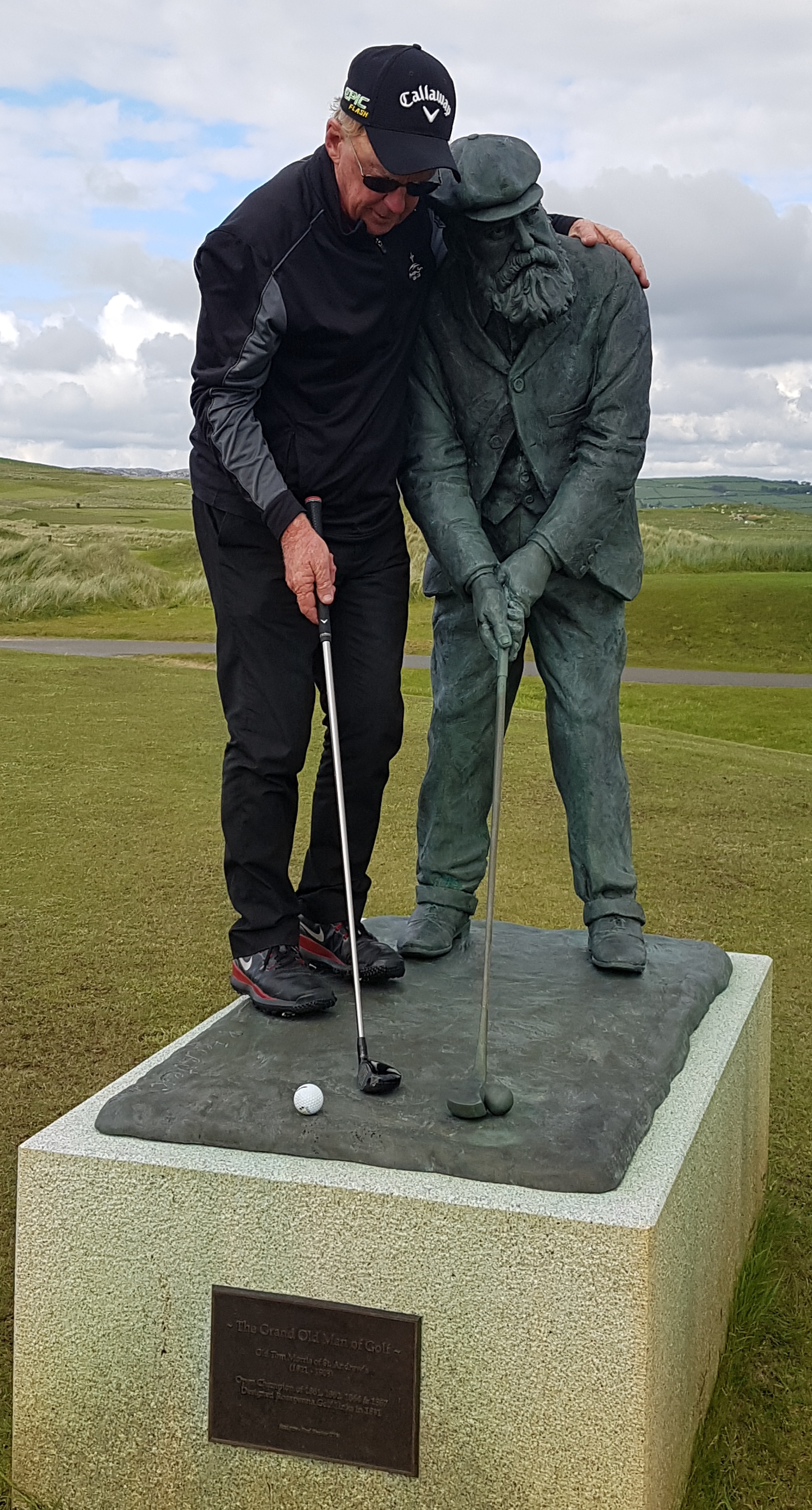 Bernie thinks he affording ‘Old Tom’ a wee set-up tip during his visit last year to Rosapenna. The statue of ‘Old Tom’ greets golfers at this famed Co. Donegal course. (Photo – www.golfbytourmiss.com)