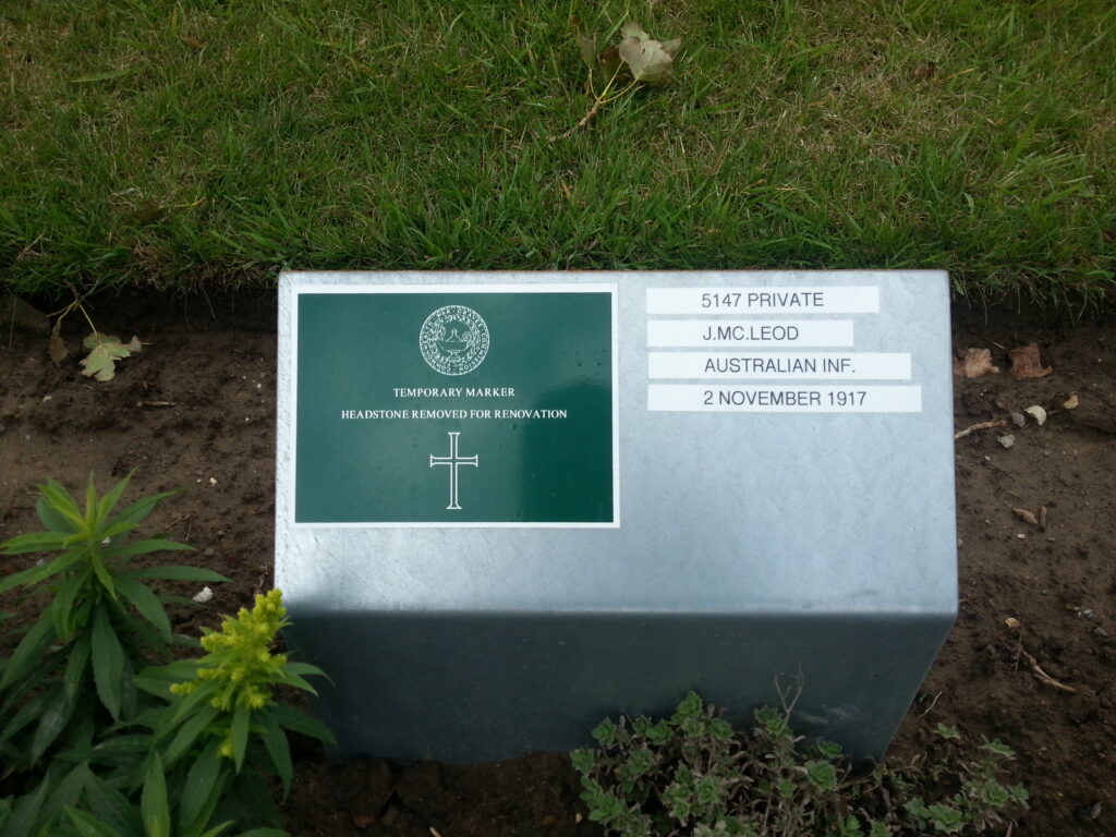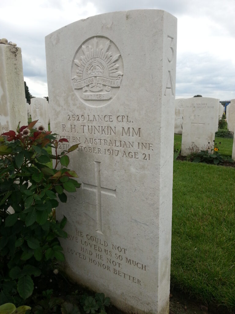 Two Australian recipients of the Victoria Cross buried in the cemetery are Captain Clarence Smith Jeffries (1894–1917), and Sergeant Lewis McGee (1888–1917). Jeffries led an assault party and rushed one of the strong points at the First Battle of Passchendaele on 12 October 1917, capturing four machine guns and thirty five prisoners, before running his company forward again. He was planning another attack when he was killed by an enemy gunner. On the same day, McGee, who had earned his decoration eight days earlier at Broodseinde, was killed charging an enemy pillbox in the same battle.
