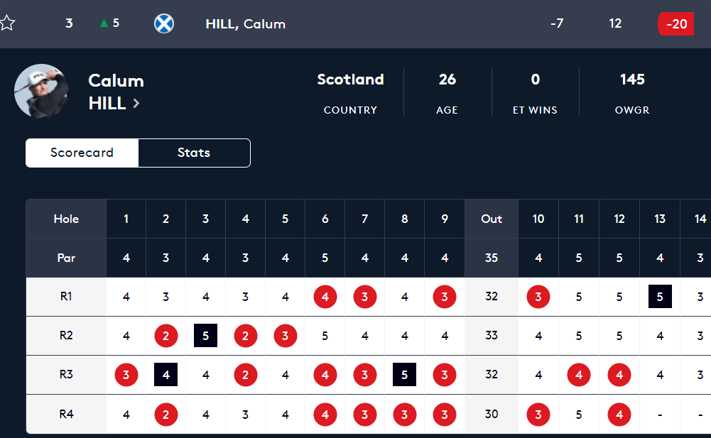 Calum Hill’s sensational run of what would be seven birdies in eight holes from the 6th to 13th holes