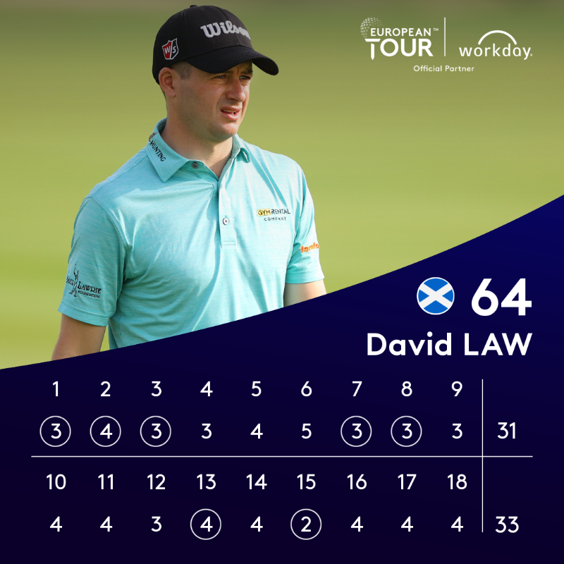 The Scot’s effort, and in a 66th main Tour event, matches a 64 on day one of last July’s British Masters while Law has shot 64 three times on the secondary Challenge Tour.
