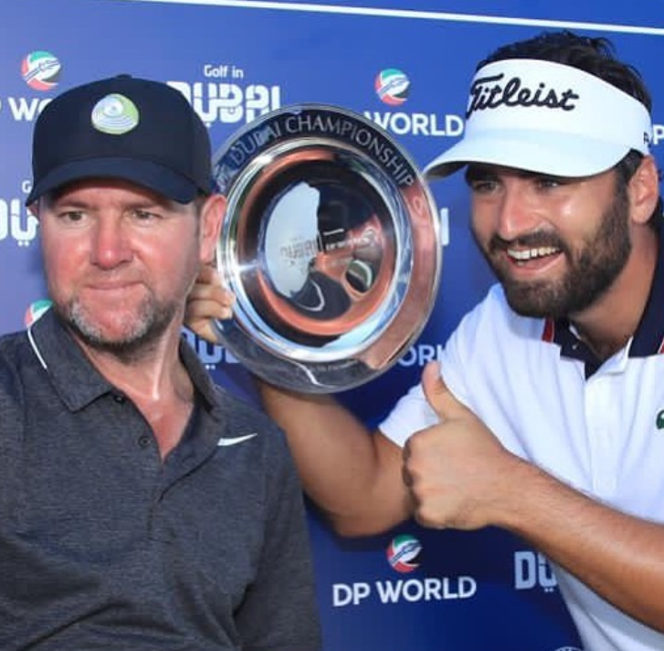 Irish caddy Darren Reynolds celebrating with Antoine Rozner last December after capturing the 2020 Golf in Dubai championship. Photo – Thank you Darren Reynolds.