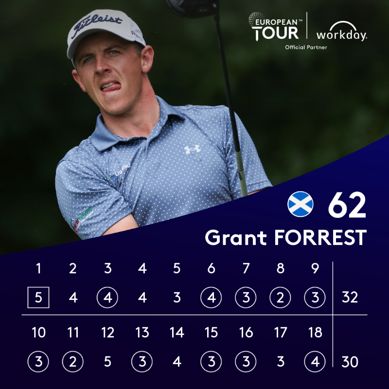 Forrest bogeyed his first but then brilliantly blasted out 11 birdies in a scintillating 10-under par 62 but with a ‘preferred lie’ rule in place in the bright but windy conditons on the Torrance course.The Craigielaw golfer moved to 18-under-par before being joined by Hill who added a 65 and just two days after setting a new course record of 63.