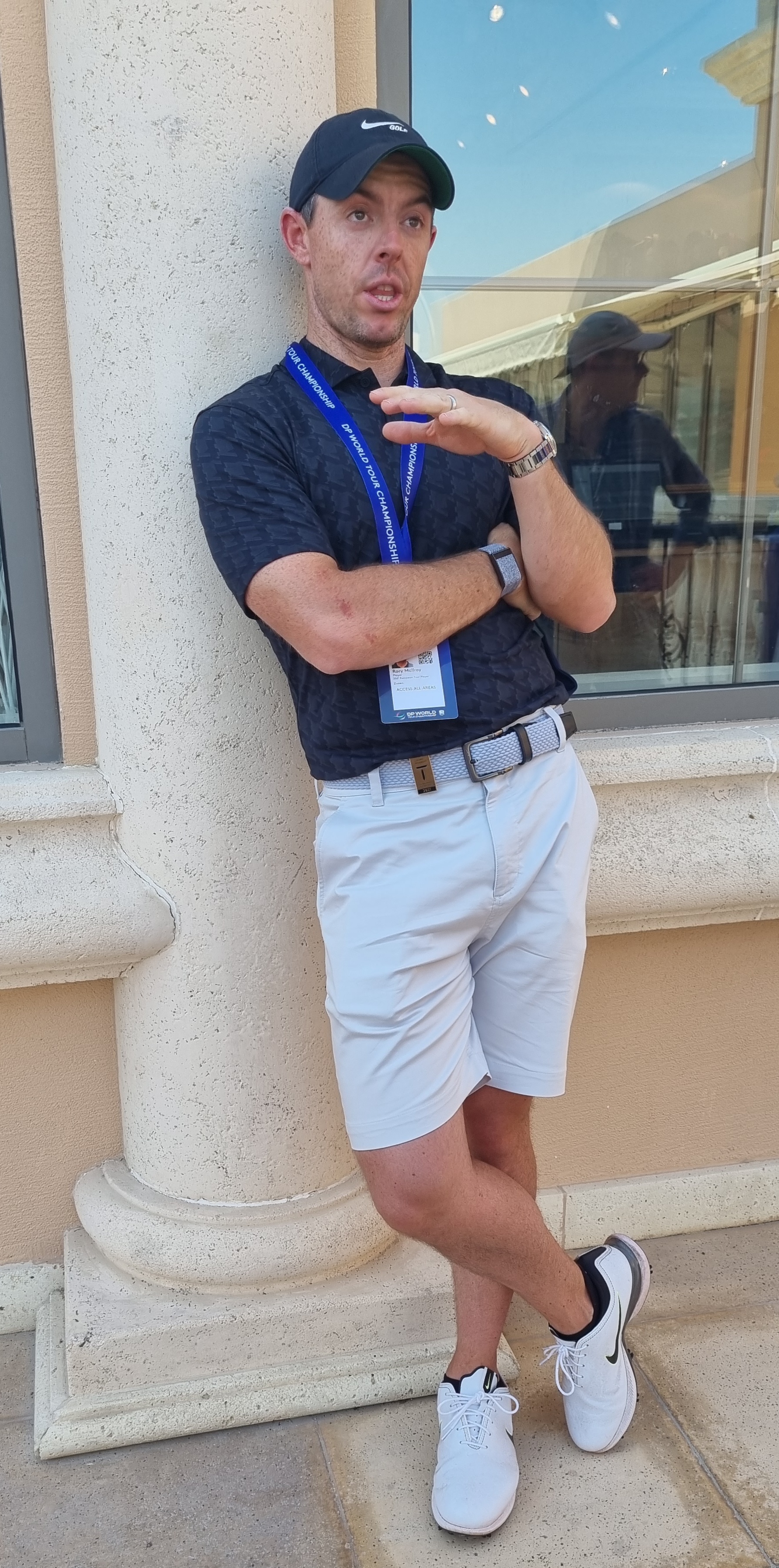 Double DP World winning Rory McIlroy looking really chilled out leaning against the wall at the Pro Shop at Jumeirah Estates (Photo – www.golfbytourmiss.com)