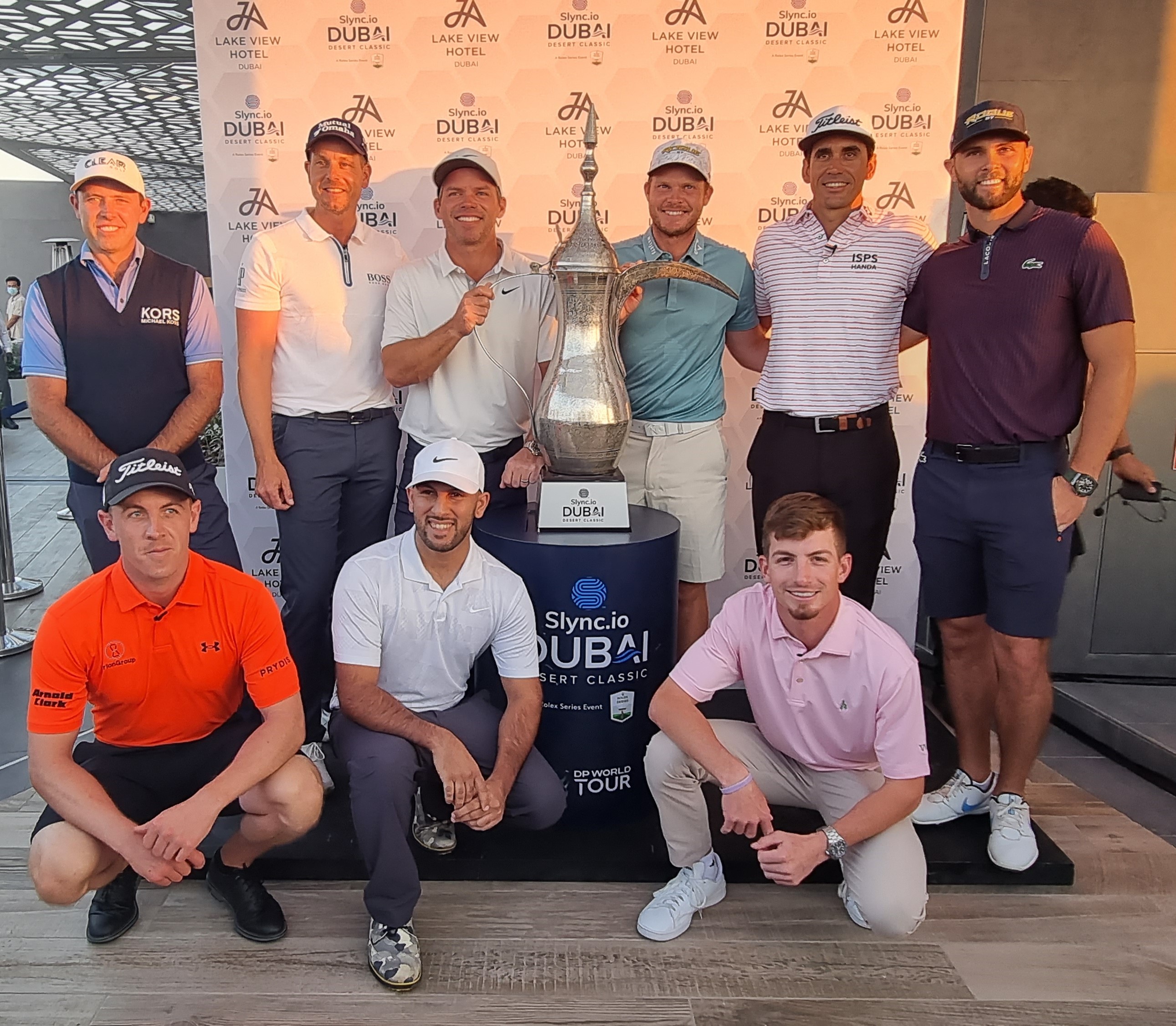 Grant Forrest (orange shirt) with his fellow DP World Tour stars at tonight’s ‘Lake View Rooftop Challenge’ along with the Slync.io Dubai Desert Classic trophy (Photo – TourMiss)