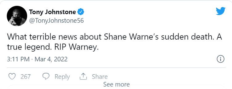 Shocked to wake to this news, what an absolute legend and Australian icon. RIP Warney. https://t.co/Xx4DszKbO4