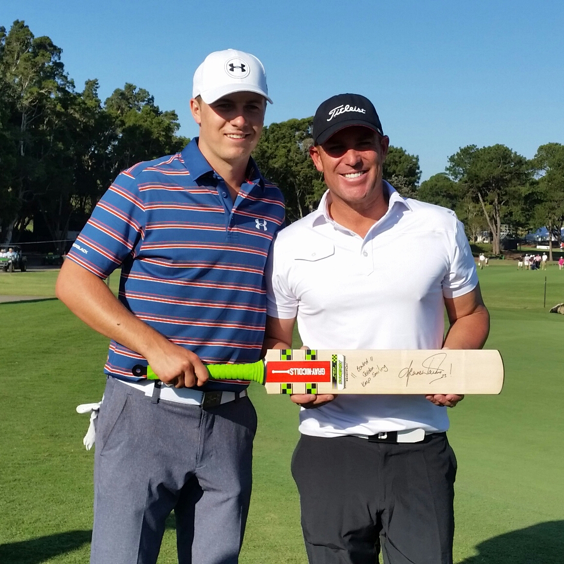 Warnie also has been a regular guest golfing charity events and pro-ams including later in 2015 when he and Aussie rugby legend, Nick Farr-Jones joined the group featuring Jordan Spieth, the then reigning Masters and US Open champion, and reigning Australian Open title-holder. There is a great shot of Spieth teeing-off with a cricket bat.