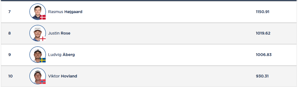 Of the 12 Europeans who competed two years ago in Rome only Spanaird Jon Rahm, currently ranked 21st on the standings, and Nicolai Hojgaard and presently lying 22nd, are outside of the top-10.