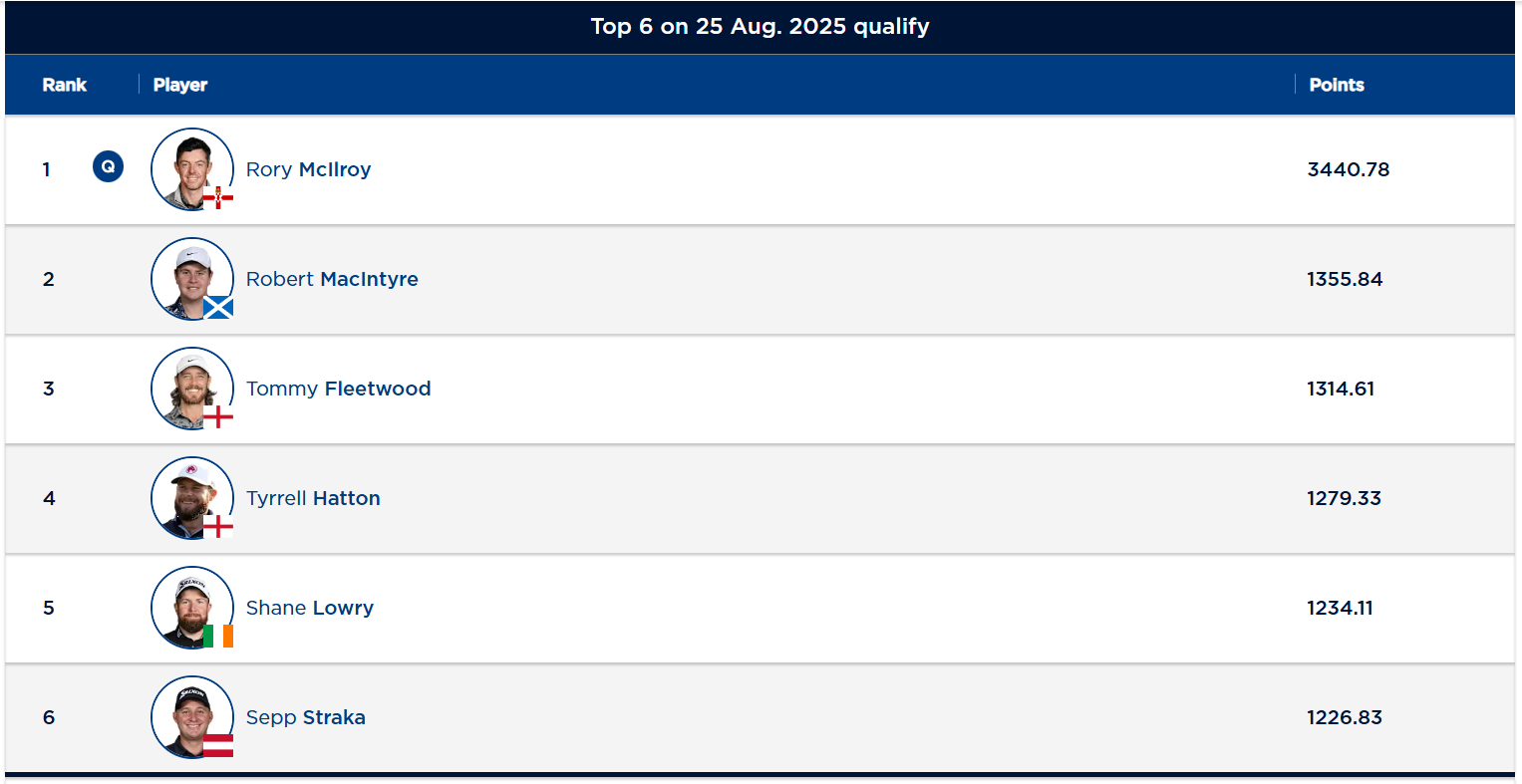 Europe’s top-six qualifiers off the 2025 European Team ranking will be confirmed on August 25th, the day following the British Masters on the DP World Tour and the PGA Tour’s Tour Championship and with Rory McIlroy continuing the lead the way as he has done since qualifying got under way.