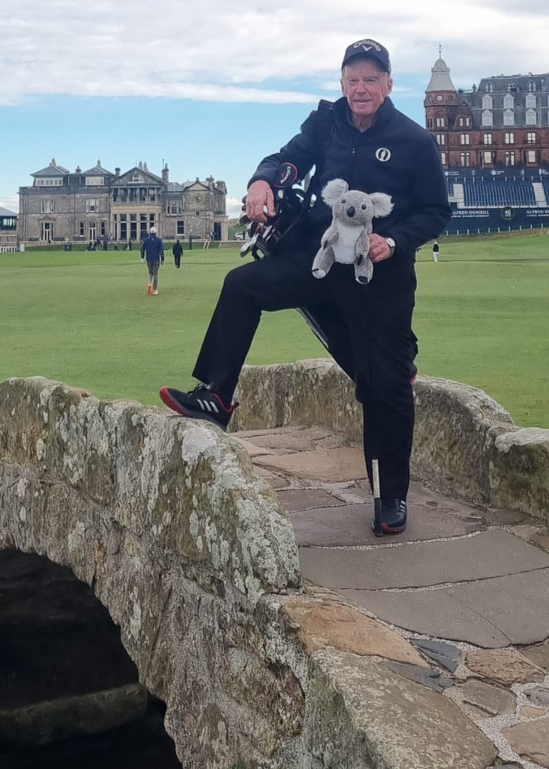 Happy days. The new Ted Koala crosses the Swilcan Bridge for a first occasion in October this year and the day post the Alfred Dunhill Links Championship. PS: And we combined to walk off the 18th with a super par. (Image – @TOURMISS)