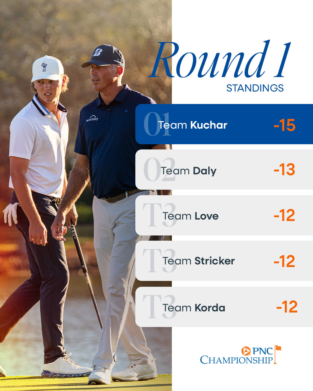 Matt Kuchar with son Cameron superbly combined to post a sizzling 57 for a two shot lead on the opening day of the 2025 PNC Championship on the Ritz Carlton course in suburban Orlando.