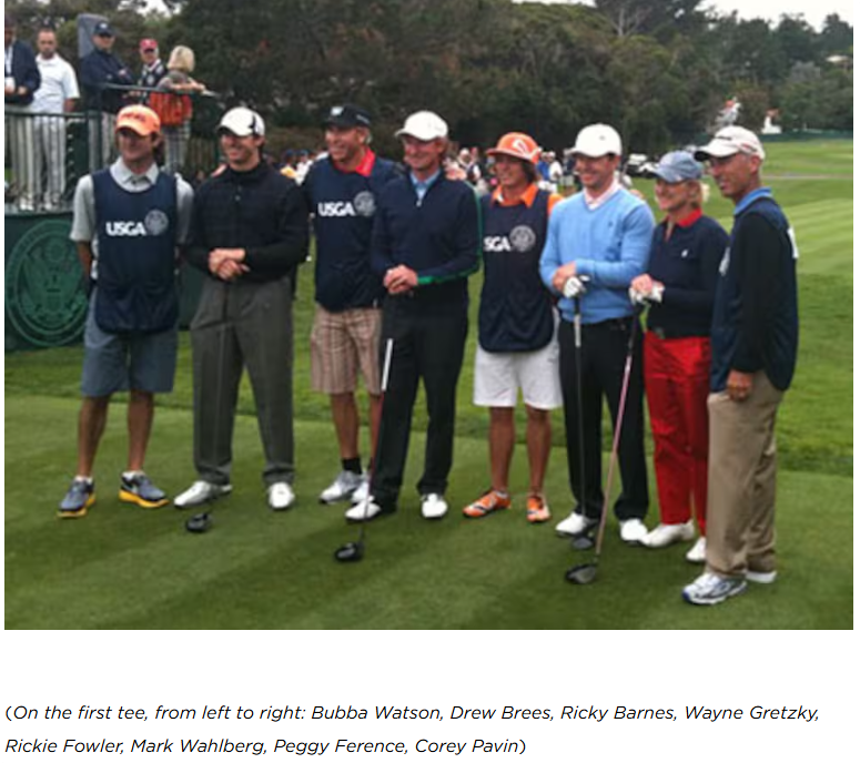 The then 21-year-old Caddy Rickie Fowler (fourth right) cadding for Mark Wahlberg (third right) in the June 2010 Golf Digest US Open Challenge at Pebble Beach. (Images USGA)