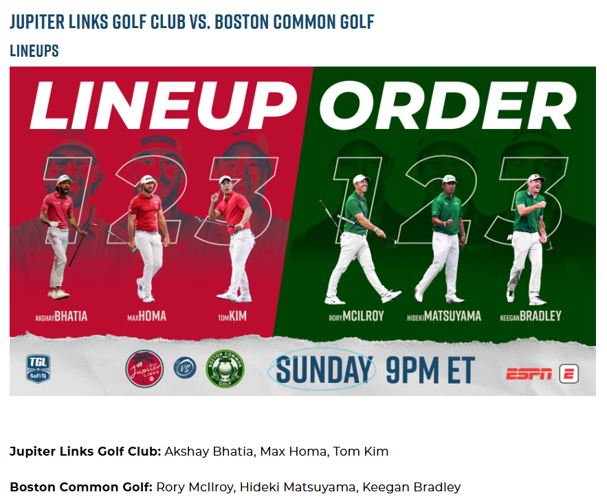 This is a massive rematch from Season 1’s opener, where JUP pulled off a dramatic 4-3 overtime win over BOS—featuring clutch plays from Tom Kim and a tense Tiger Woods vs. Rory McIlroy showdown.